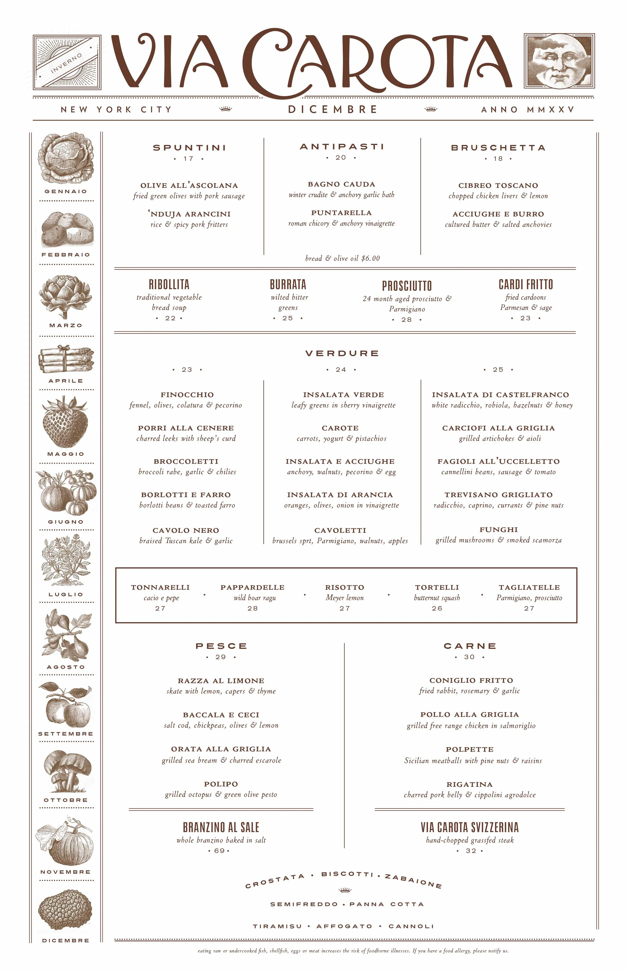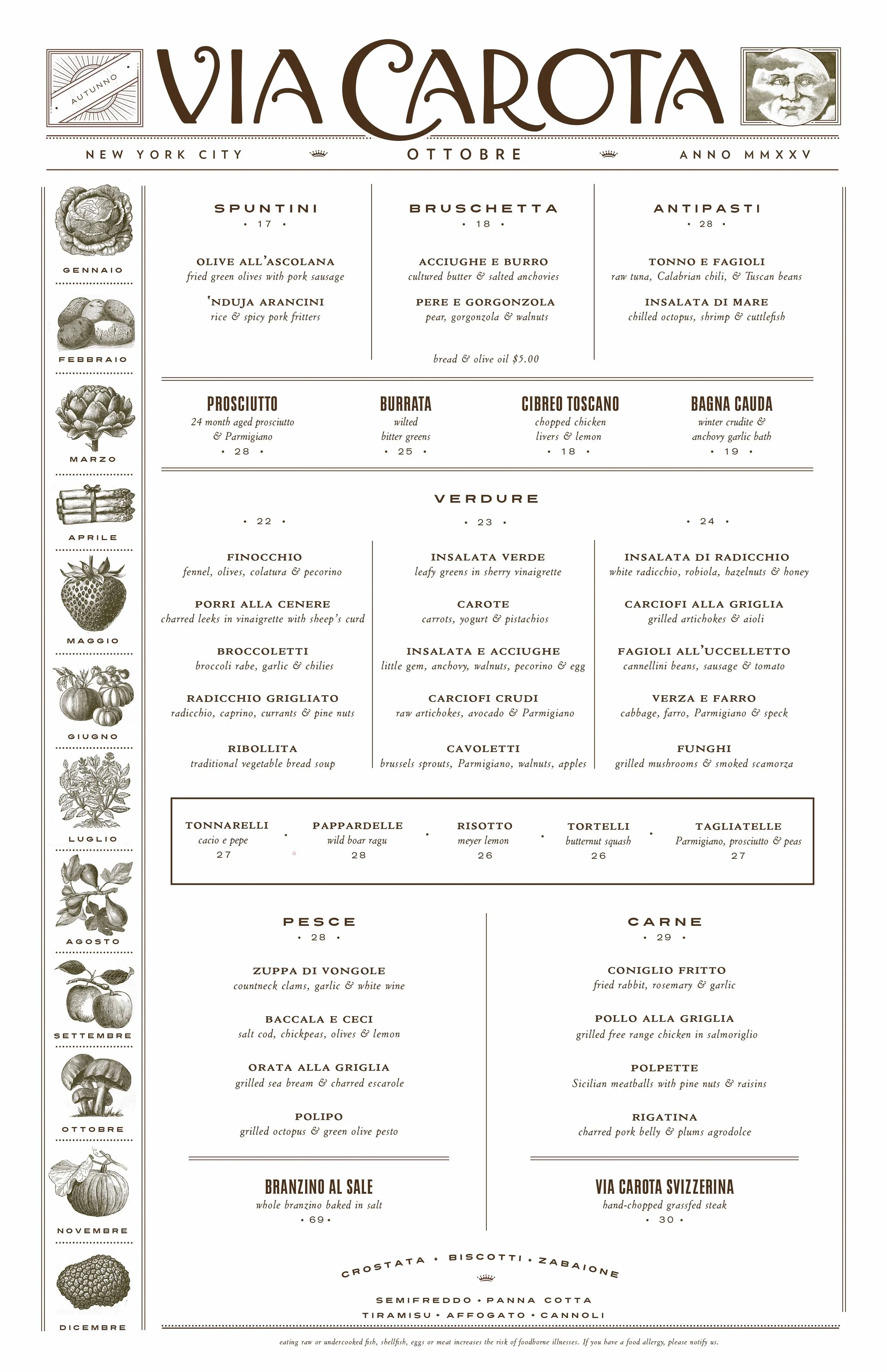 Via Carota is the West Village osteria of celebrated downtown chefs Rita Sodi and Jody Williams. Renowned for its simple, seasonal menu, Via Carota serves Italian food reminiscent of home in a spirit of relaxed care and warmth.